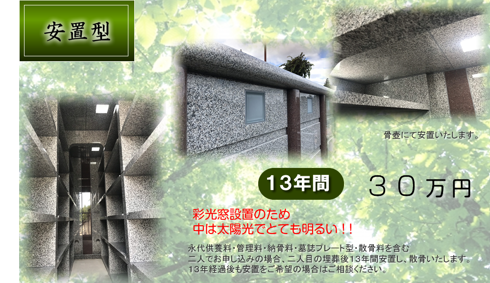 「悠久の礎」とはお墓参りをしてくれる人がいない、またはお墓参りに行けない方に代わって、霊園が管理や供養をする埋葬方法です。埋葬後の費用は一切かかりません。 安置型の場合は、骨壺のまま13年間(期間延長可)保管したのち合祀いたします。 (二人でお申し込みの場合は二人目を埋葬した日から13年間保管) 散骨型の場合は、骨壺での保管期間はなく粉骨後に合祀いたします。